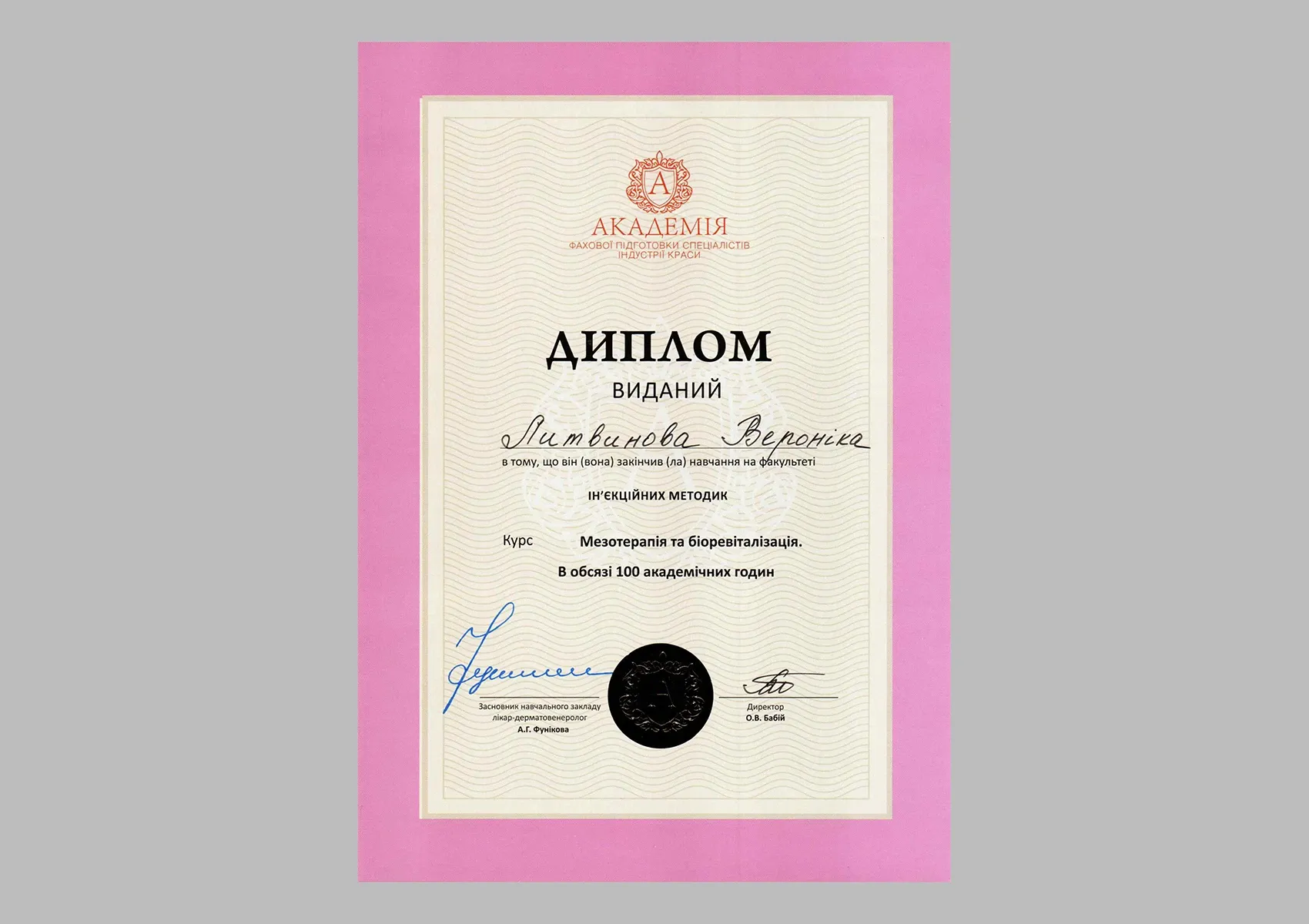2018 – Академія фахової підготовки спеціалістів індустрії краси, курс “Мезотерапія і біоревіталізація”
