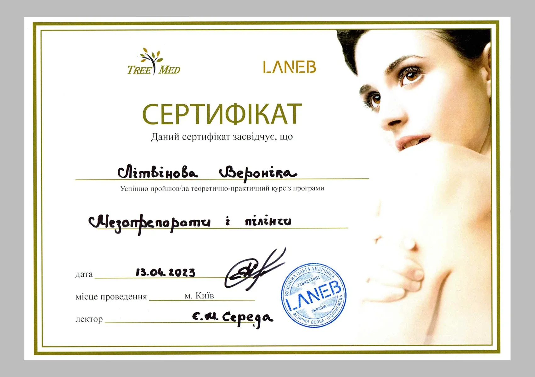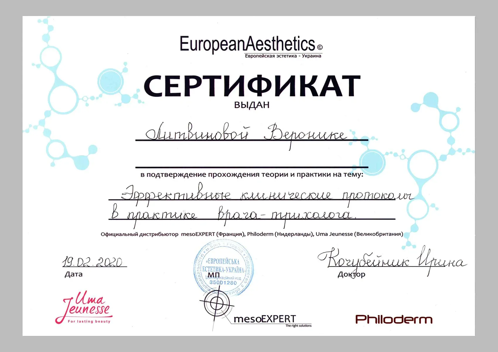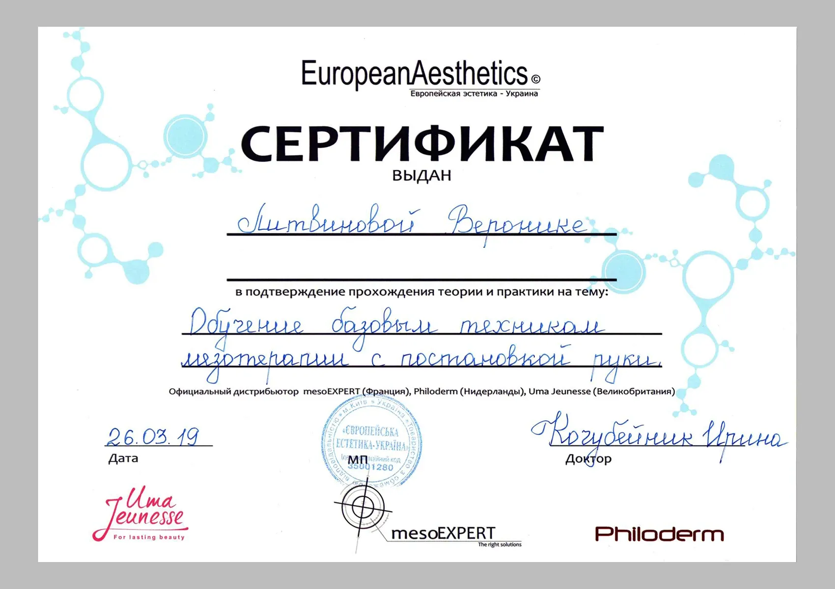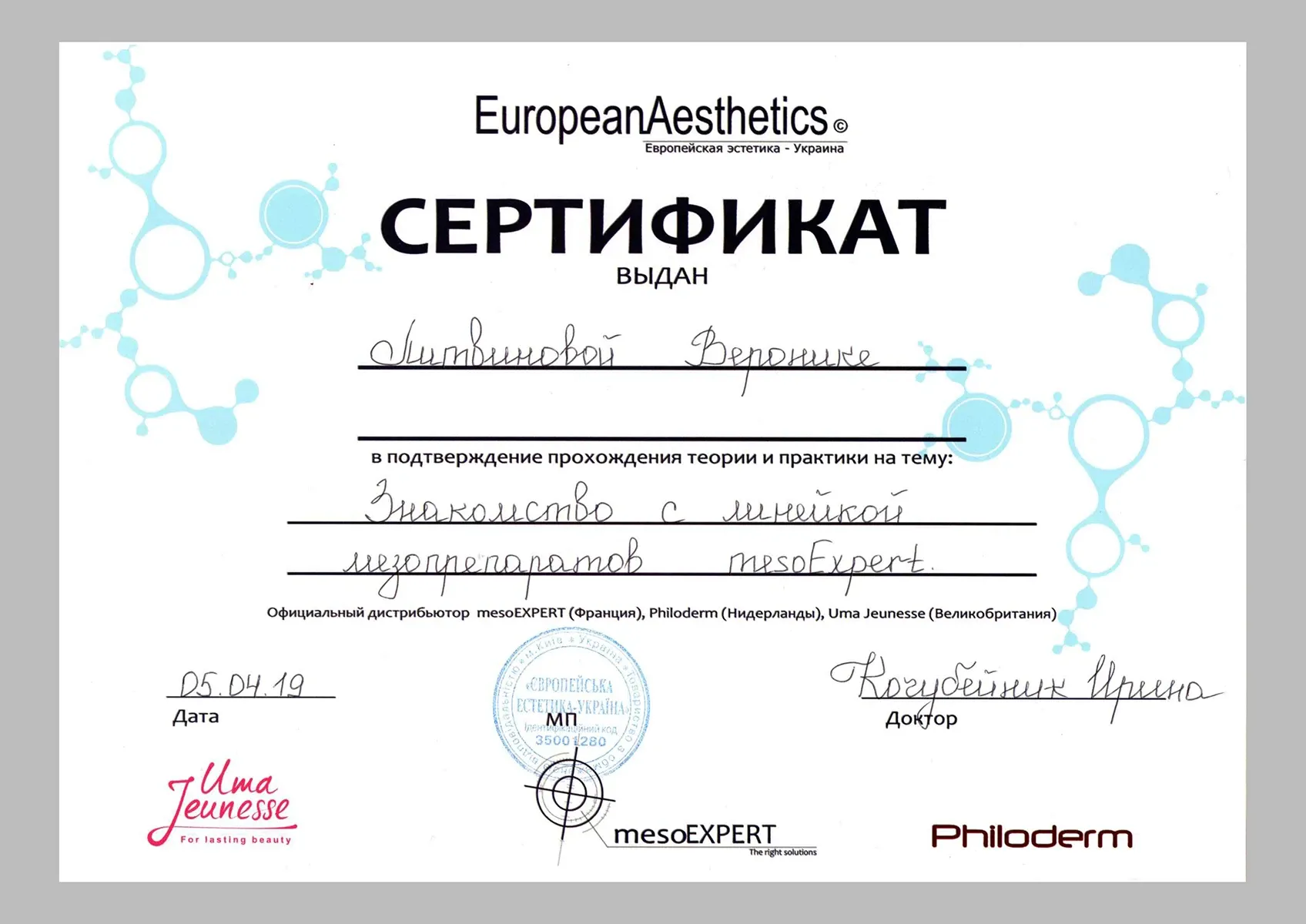 2019 – Індивідуальне навчання технікам мезотерапії на препарат MesoExpert Франція (підвищення кваліфікації)