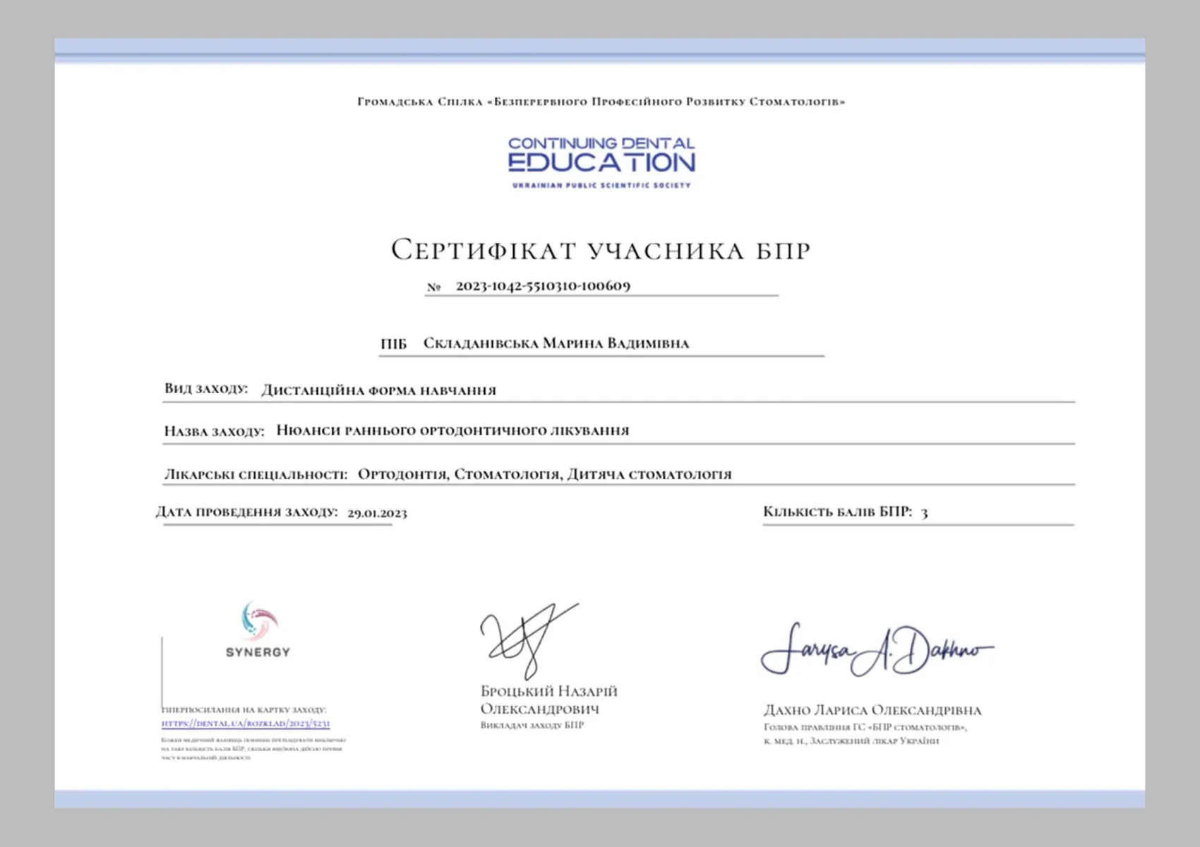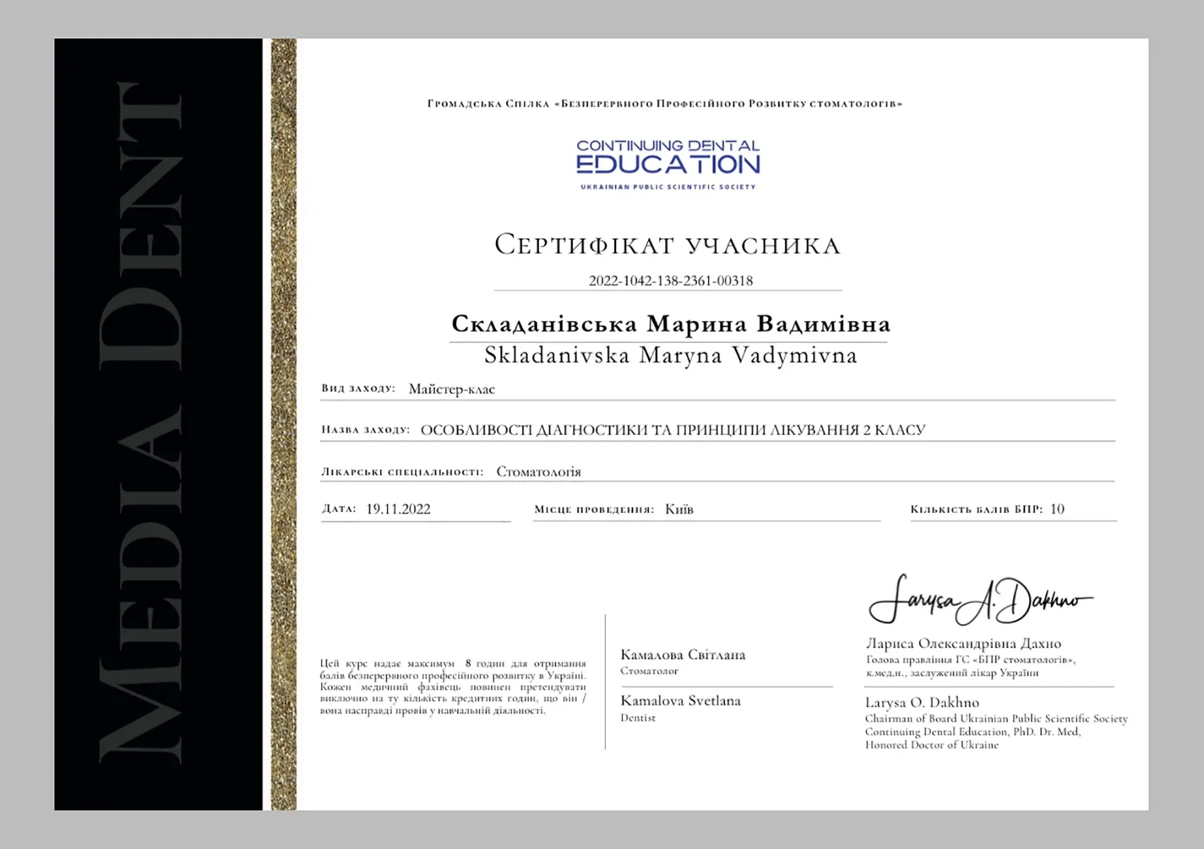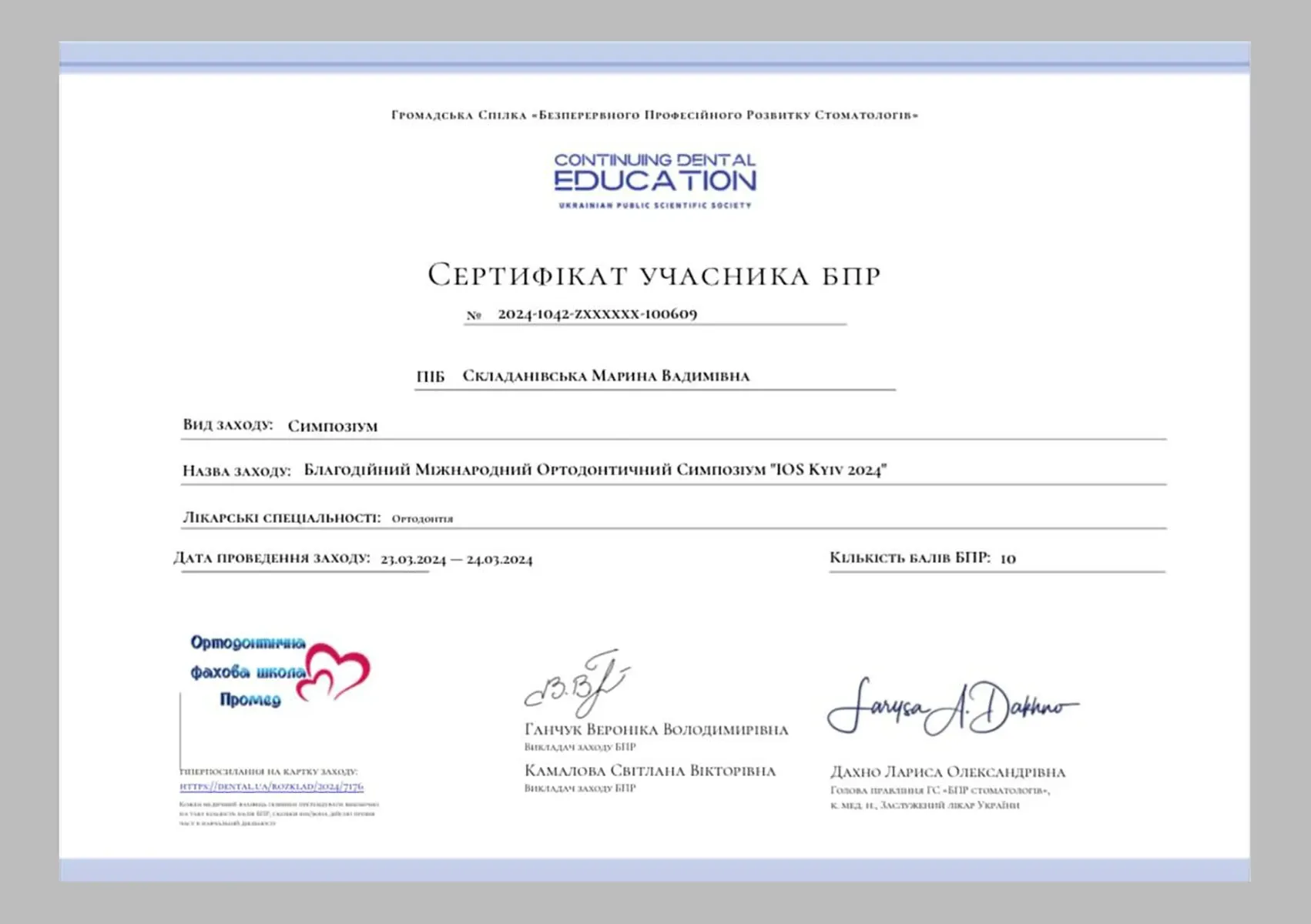 З 2023 по 2024 роки пройшла підвищення кваліфікації в Національному університеті охорони здоров’я України імені П. Л. Шупика за спеціальністю «Ортодонтія».