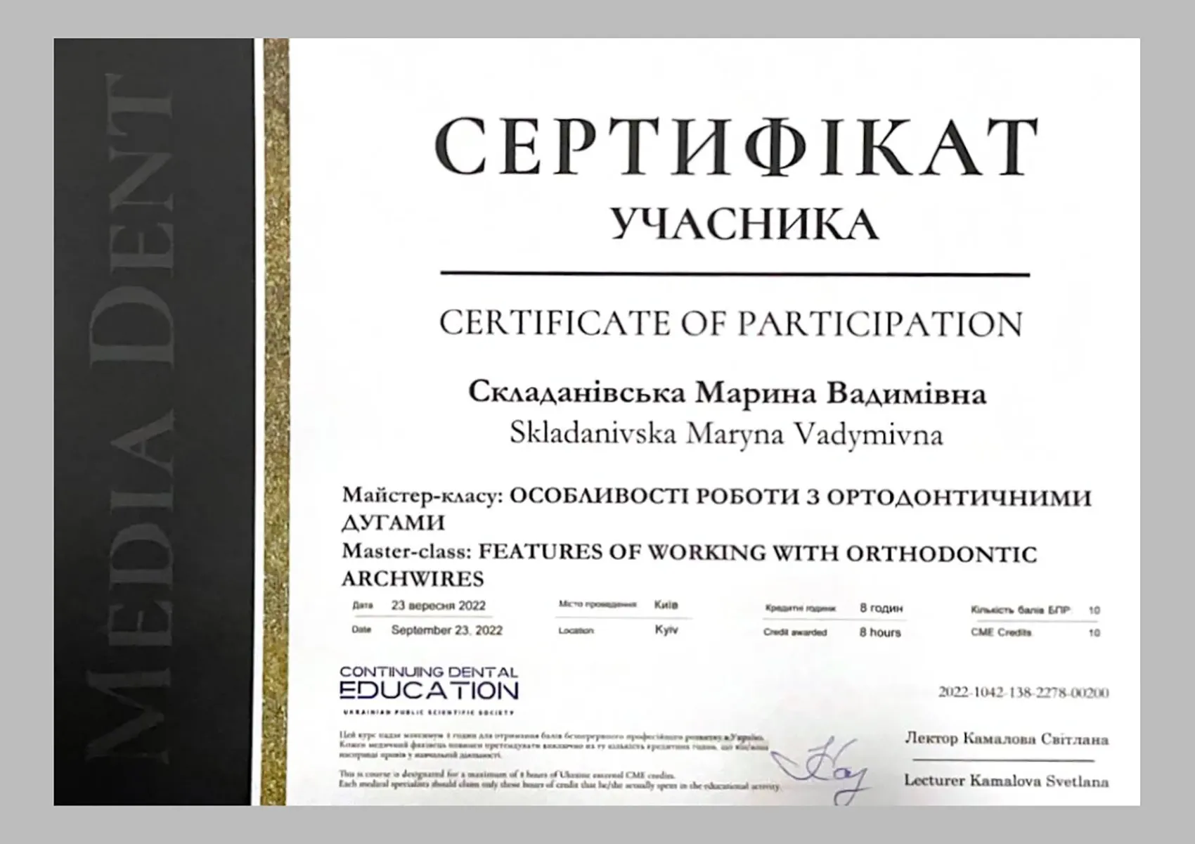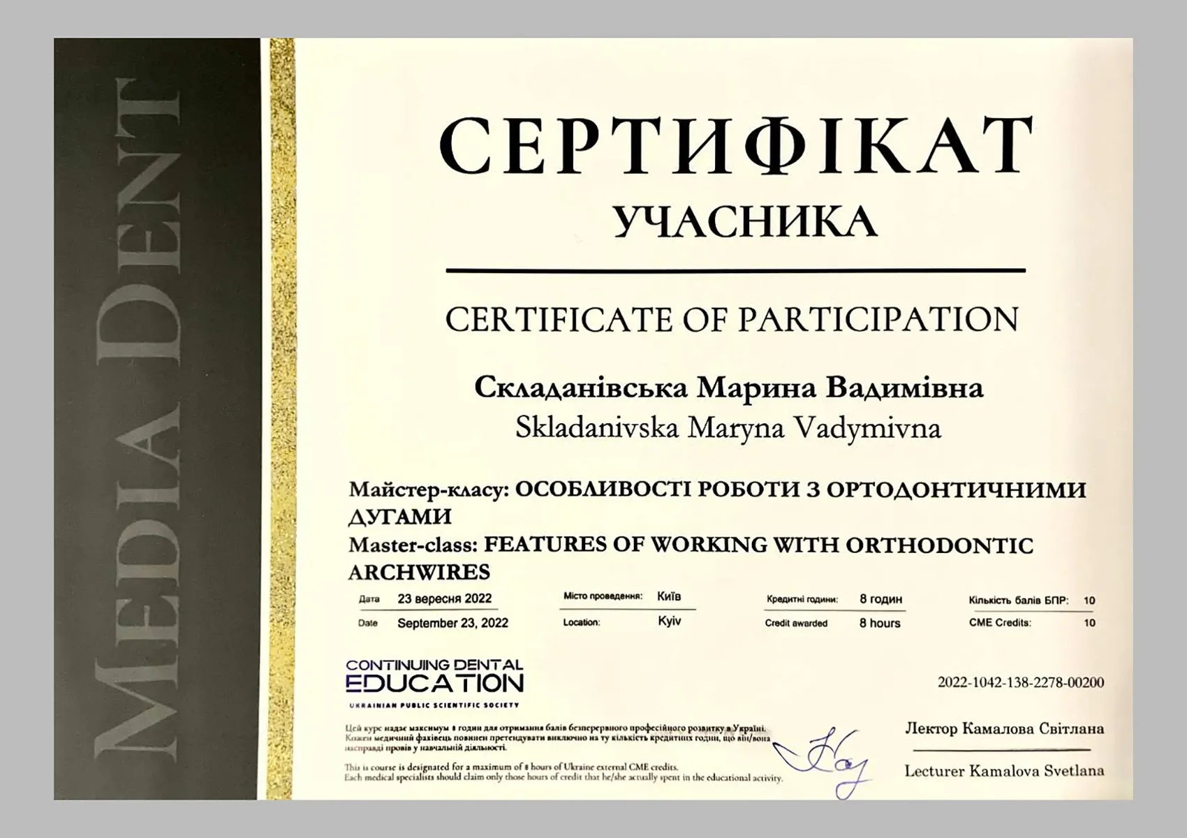 Майстер-клас: «ОСОБЛИВОСТІ РОБОТИ З ОРТОДОНТИЧНИМИ ДУГАМИ» (Світлана Камалова), Київ, 2022