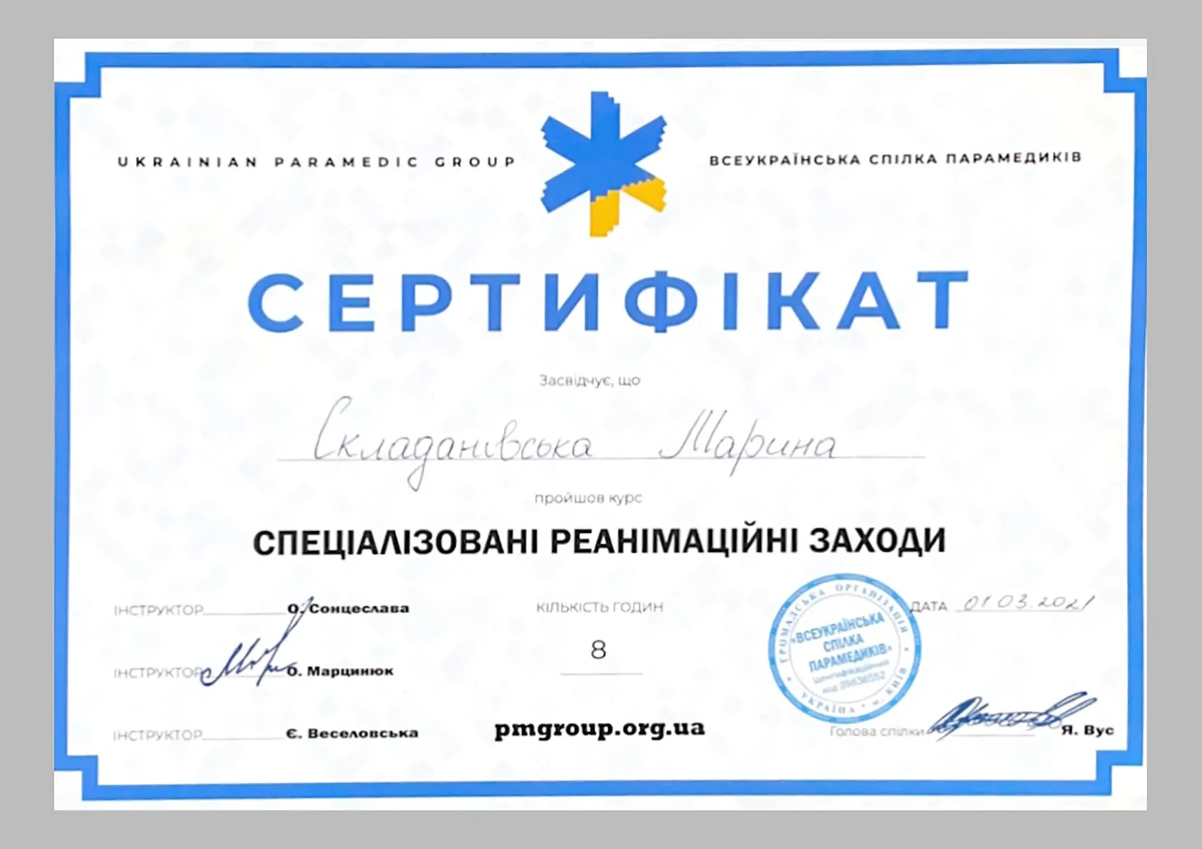 Курс “СПЕЦІАЛІЗОВАНІ РЕАНІМАЦІЙНІ ЗАХОДИ” (Всеукраїнська спілка парамедиків. Ukrainian Paramedic Group), Київ, 2019, 2020, 2021 рр.
