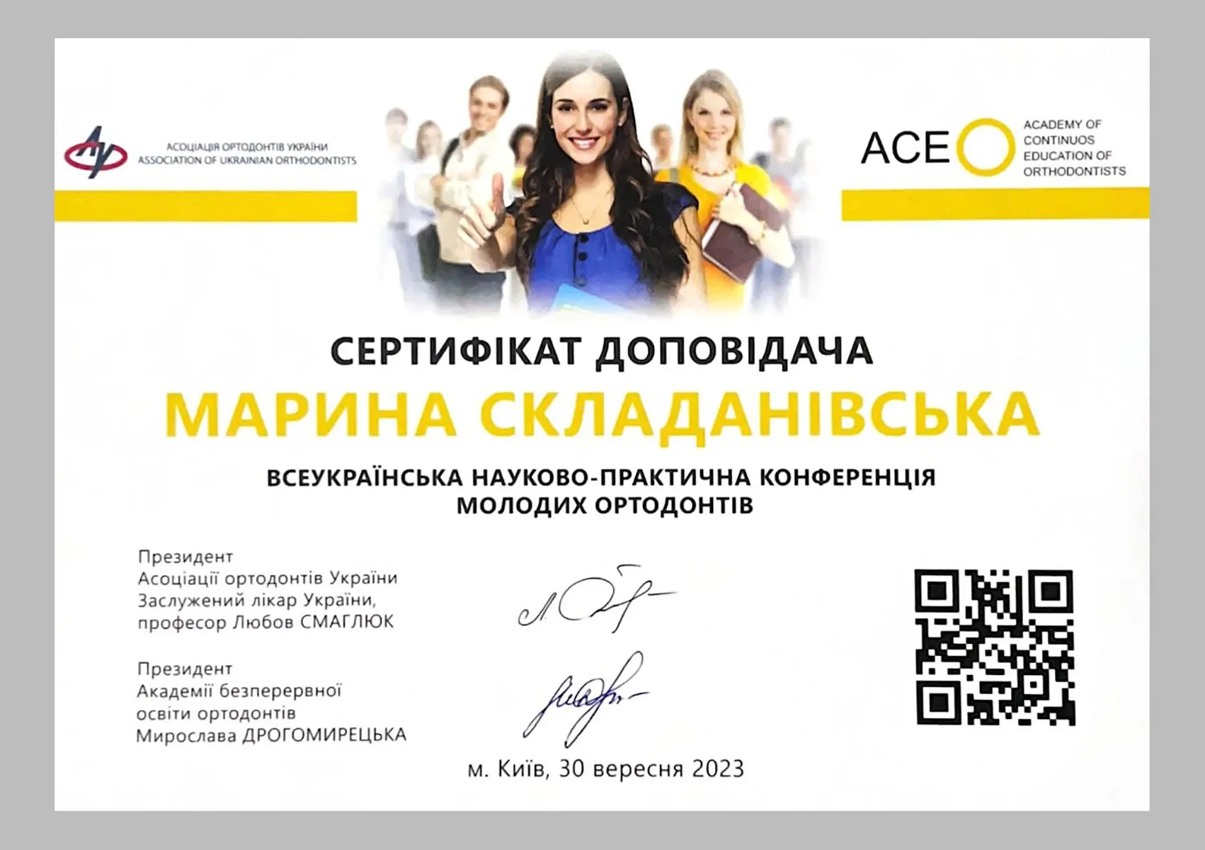 Доповідач Всеукраїнської науково-практичної конференції молодих ортодонтів із доповіддю: «РЕНТГЕН-АНТРОПОМЕТРИЧНІ НАЗО- ТА ВЕЛОФАРИНГЕАЛЬНІ ПАРАМЕТРИ В ОРТОДОНТИЧНИХ ПАЦІЄНТІВ ІЗ ПОРУШЕННЯМИ ДИХАННЯ ПРИ РІЗНИХ ТИПАХ ЩЕЛЕПНО-ЛИЦЕВОГО РОСТУ», Київ, 2023