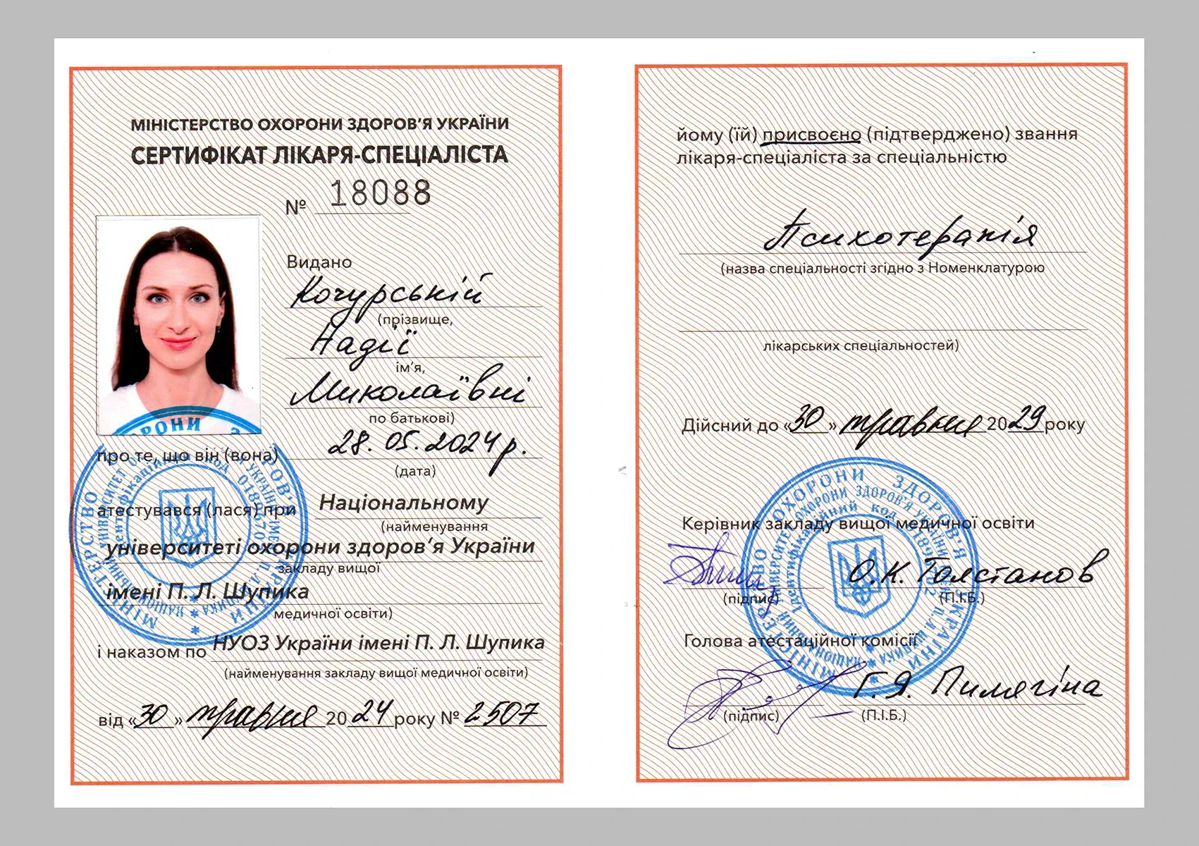 2024 – спеціалізація з психотерапії в Національній академії післядипломної освіти ім. П. Л. Шупика