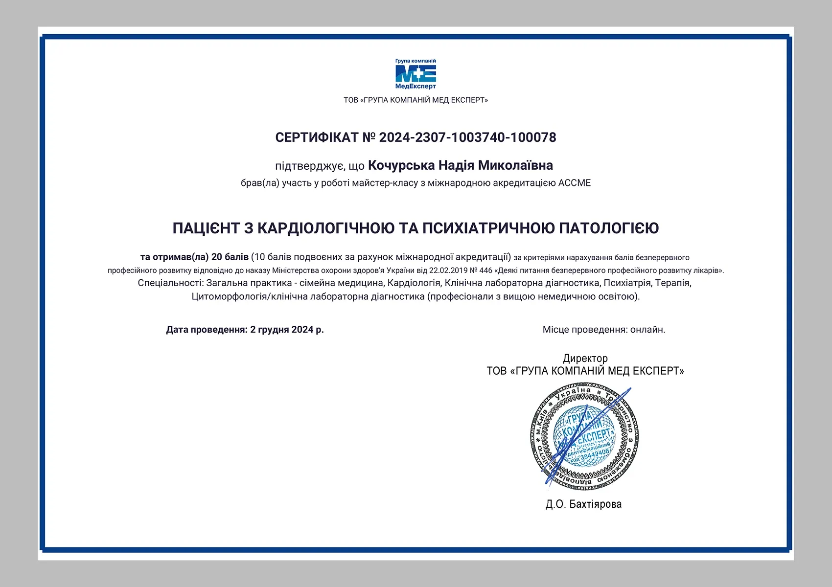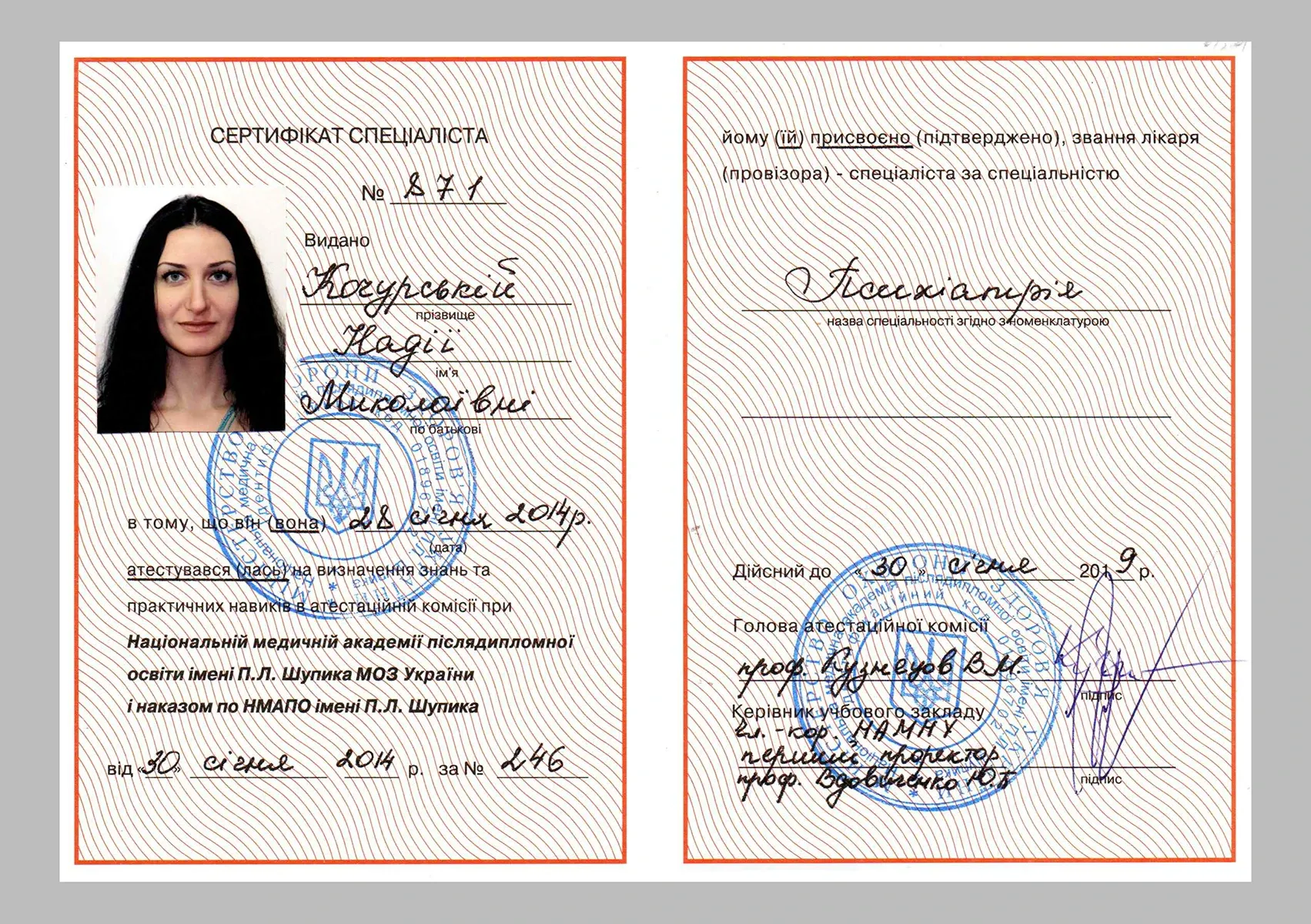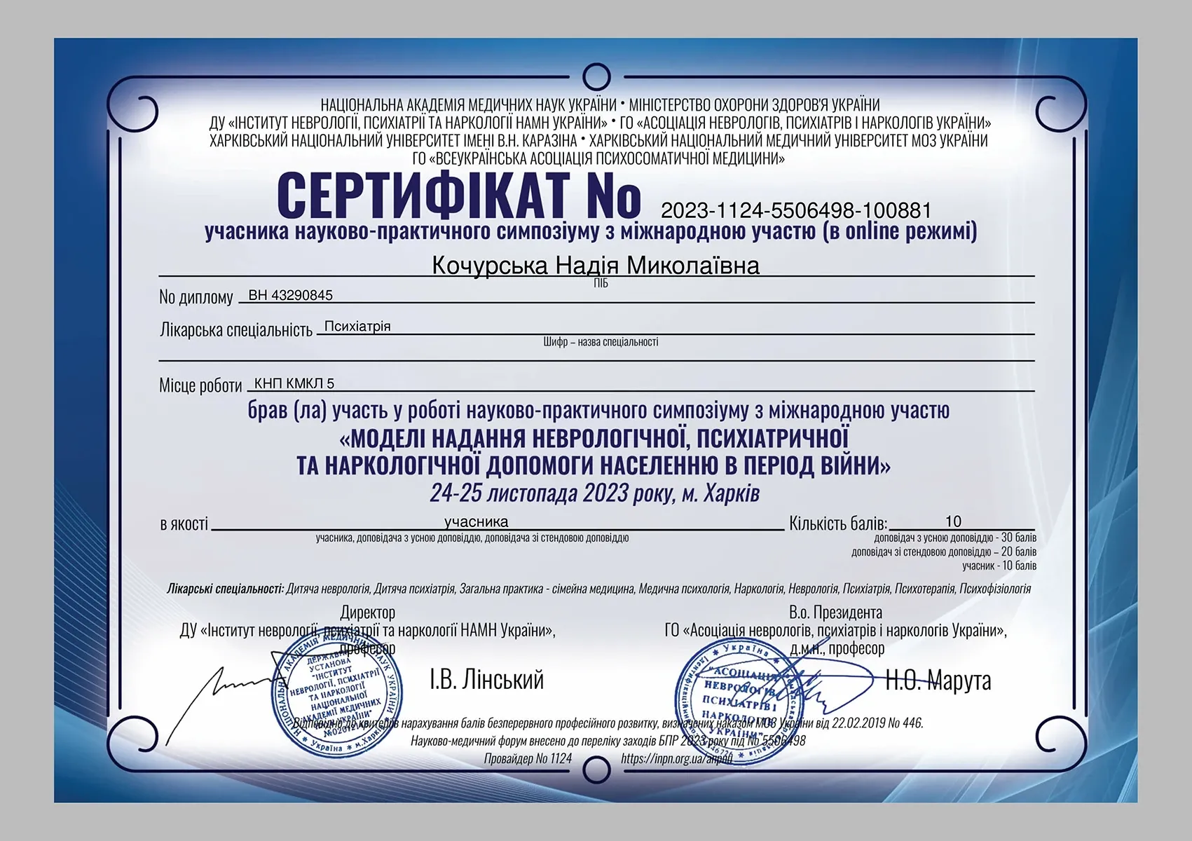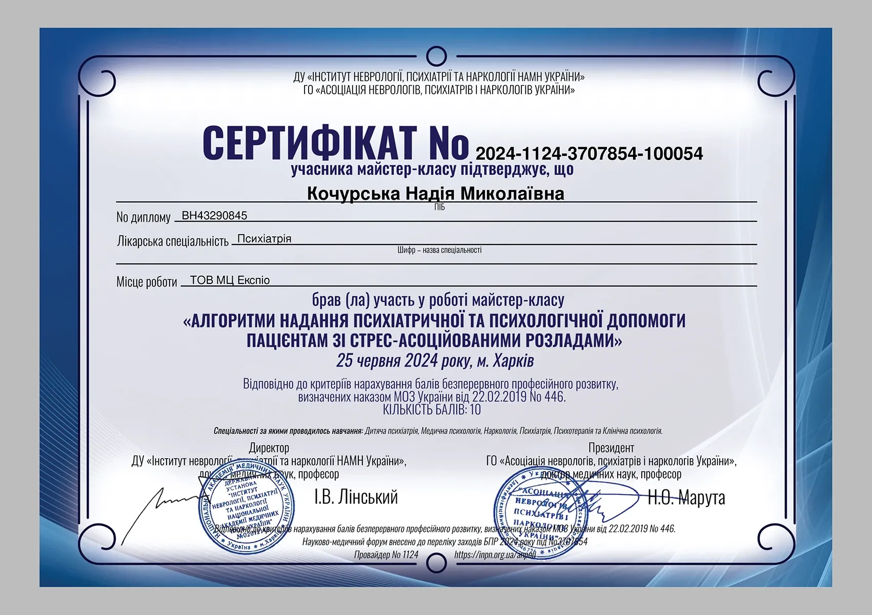 • Досвід лікування афективних, тривожних, депресивних, панічних, стресових, обсесивно-компульсивних розладів, деменції, шизофренії та інших.