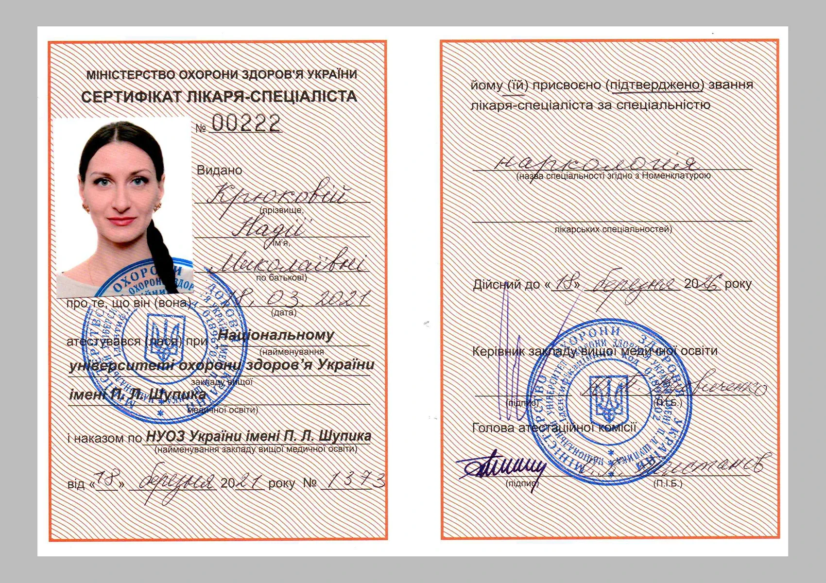2021 – стажування з наркології в Національній академії післядипломної освіти ім. П. Л. Шупика на базі КНУ «Психіатрія»