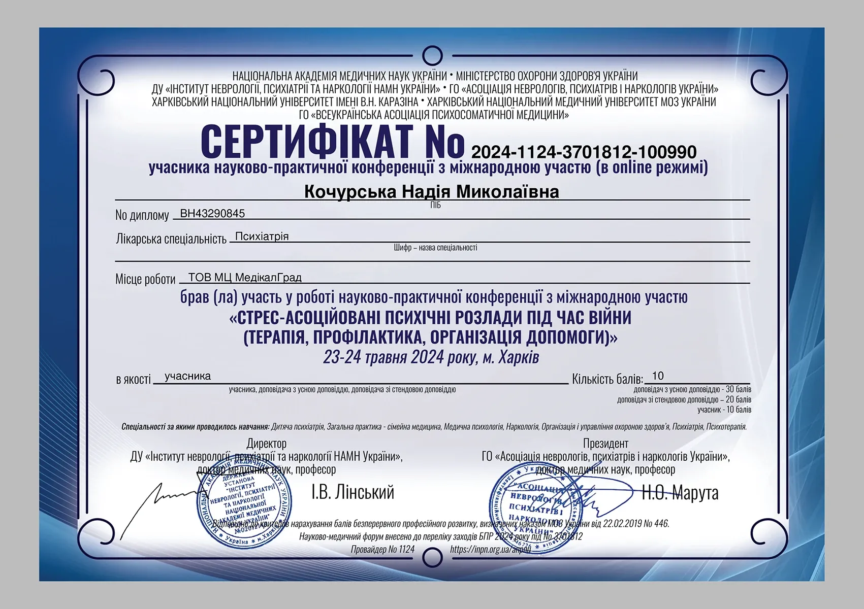 Науково-практична конференція з міжнародною участю «Стрес-асоційовані психічні розлади під час війни (терапія, профілактика, організація допомоги)» 2024