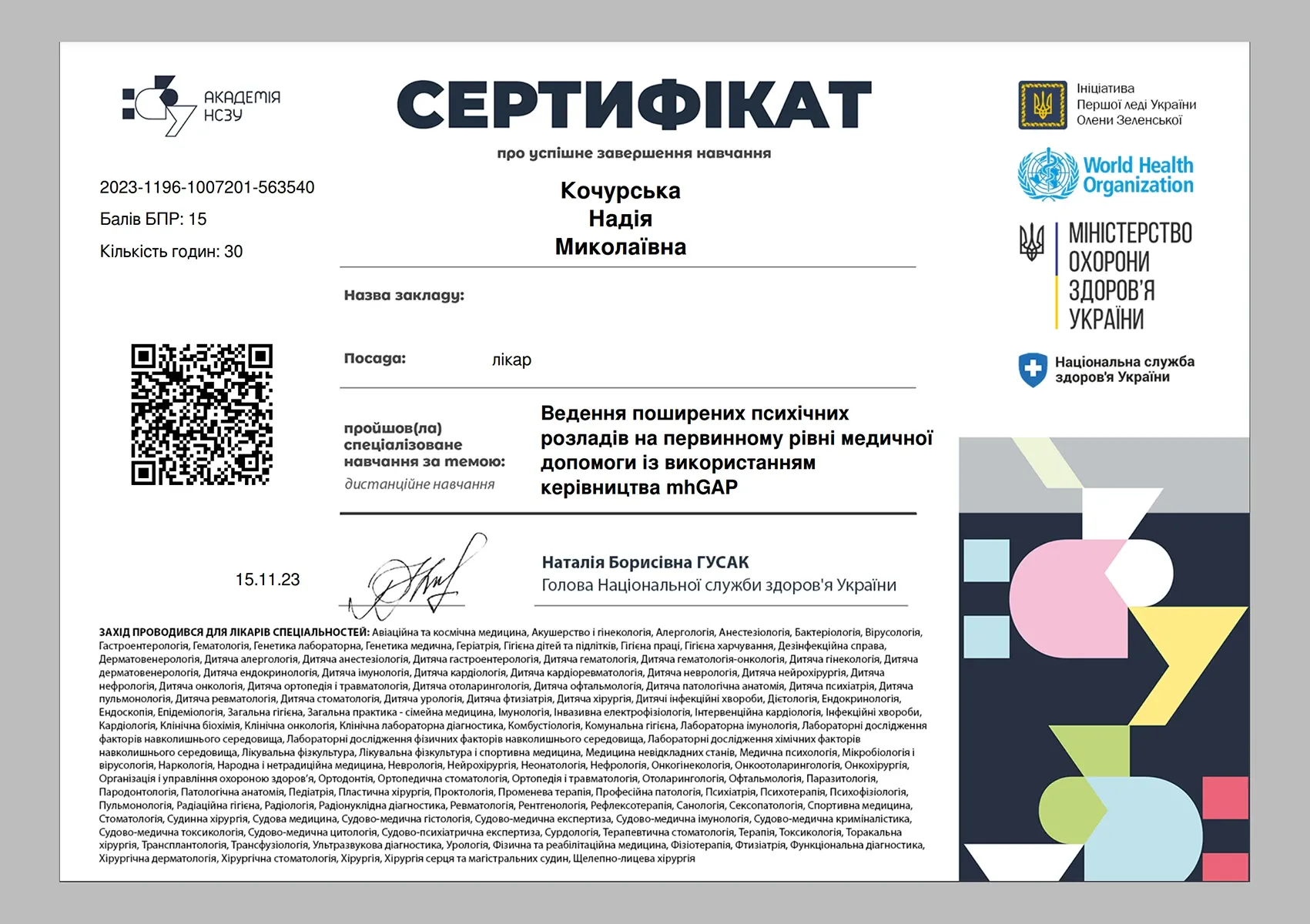 Навчання від академії НСЗУ: «Ведення поширених психічних розладів на первинному рівні медичної допомоги із використанням керівництва mhGAP» 2023