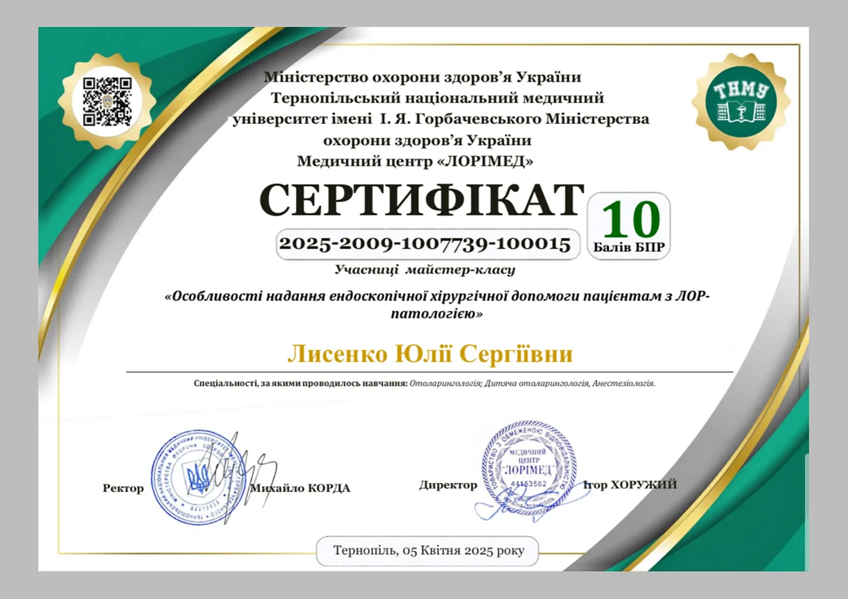 2025 р. – Майстер-клас «Особливості надання ендоскопічної хірургічної допомоги пацієнтам з ЛОР патологією».