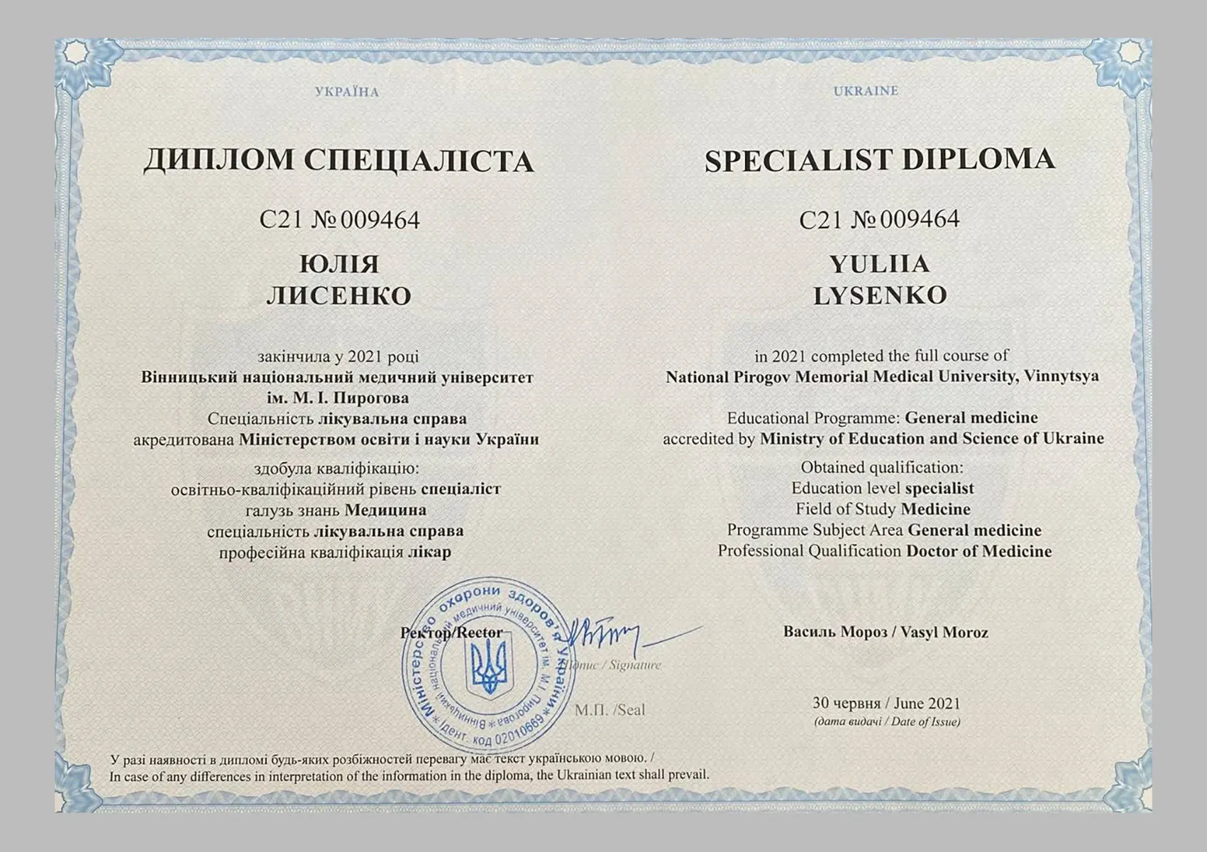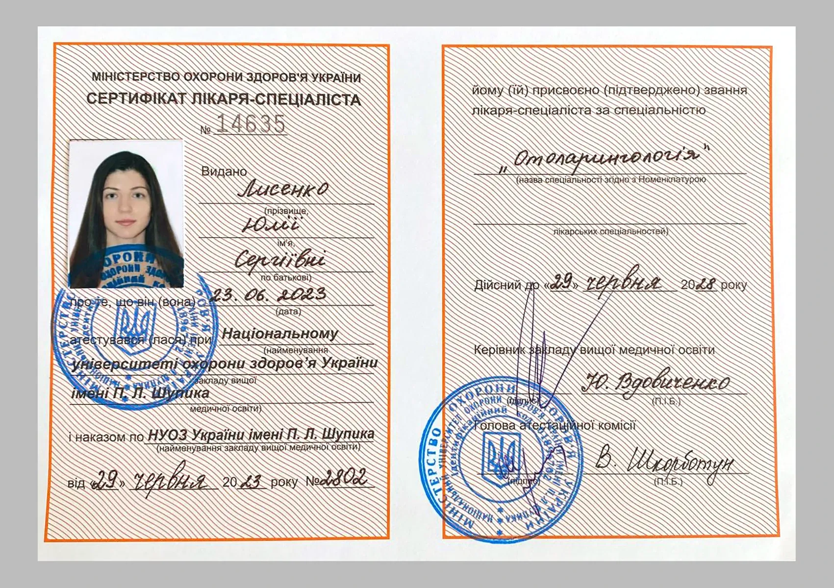 2023 р. – Університет охорони здоров’я України ім. П.Л. Шупика, спеціальність — дитяча отоларингологія.